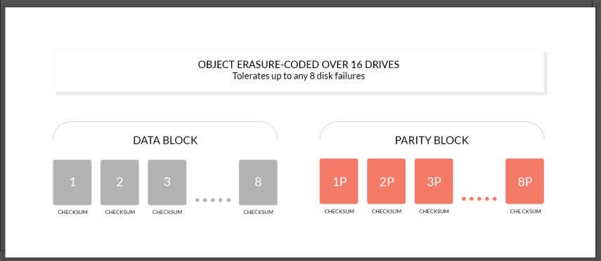- 低冗余且磁盘损坏高容忍,标准且最高的数据冗余系数为2(即存储一个1M的数据对象,实际占用磁盘空间为2M)。但在任意n/2块disk损坏的情况下依然可以读出数据(n为一个纠删码集合(Erasure Coding Set)中的disk数量)。并且这种损坏恢复是基于单个对象的,而不是基于整个存储卷的。